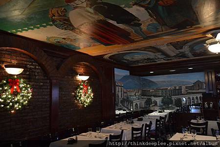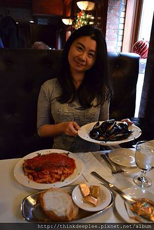 美式義大利餐廳Lucia Ristorante也是我很喜歡的店,除了食物好吃,裝潢高級價位平民更是深得我心,天花板的繪畫是該店特色,坐在窗邊沙發座即使吃著家常義大利麵也可以有約會的幸福感。餐廳名字是紀念老闆的媽媽,經典義大利麵像是Lasagna alla Lucia和Pollo Parmigiana都是招牌。我和先生在2013年平日的中午前往用餐,客人很少,先生點的Cozze Alla San Silvestro 售價10.50,主打淡菜(Mussels)。我點的Pollo Parmigina是以烤雞和蕃茄醬為特色,一大盤12.95,加上副餐的麵包是質量俱佳的用餐體驗。